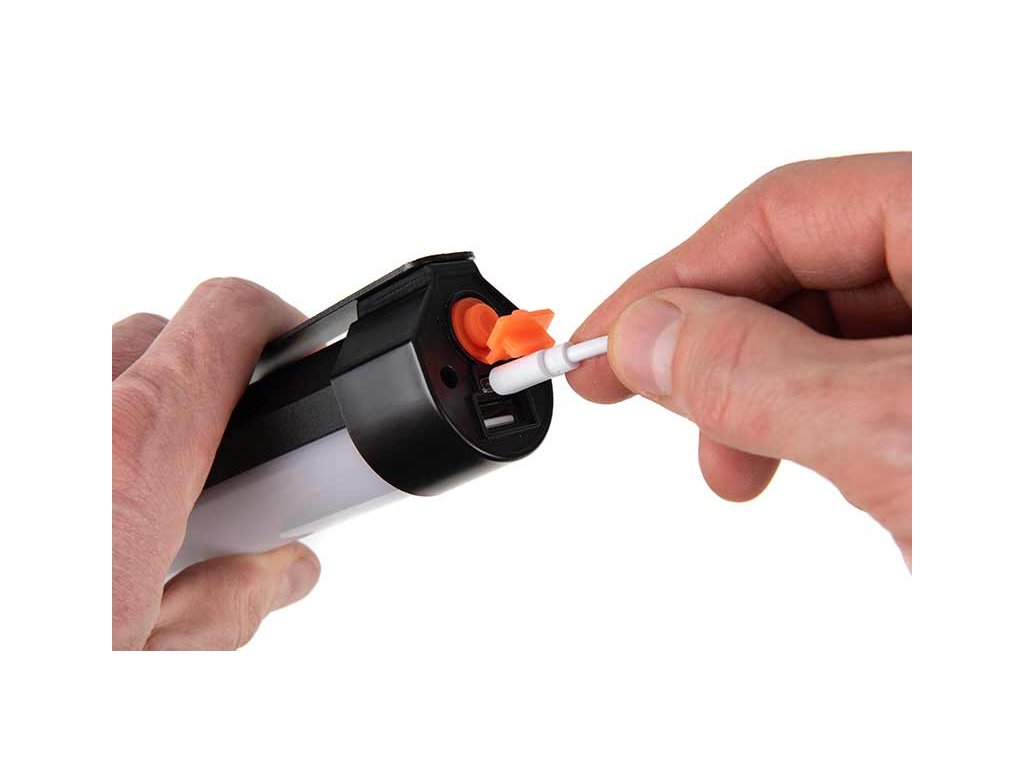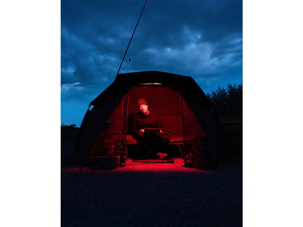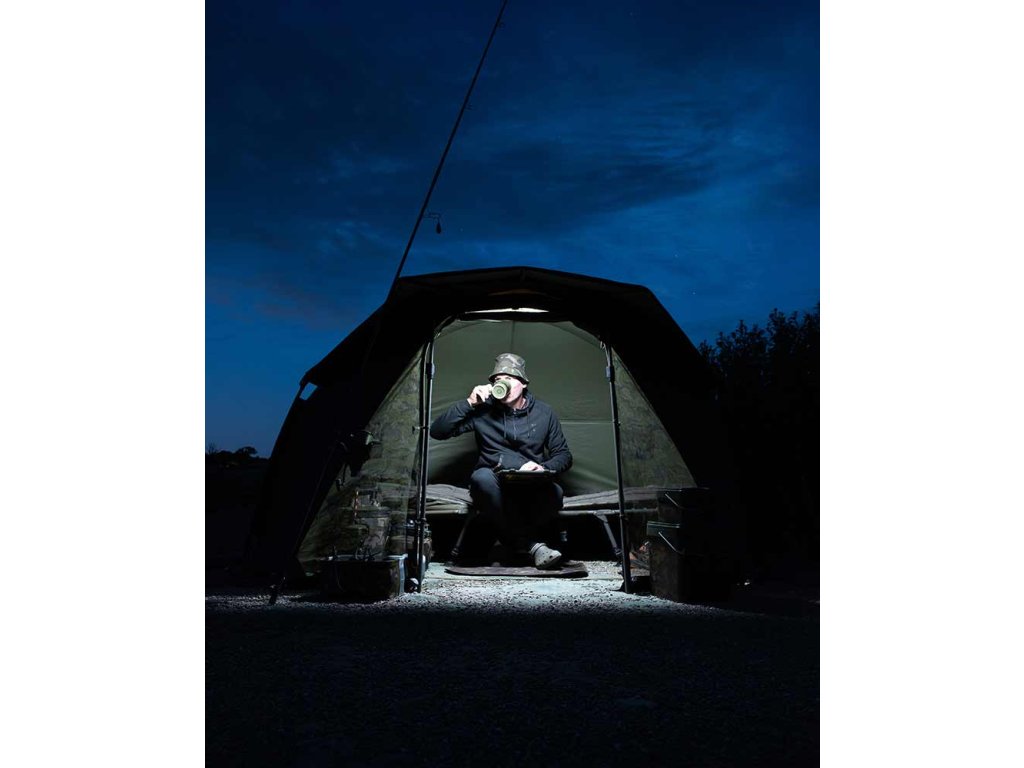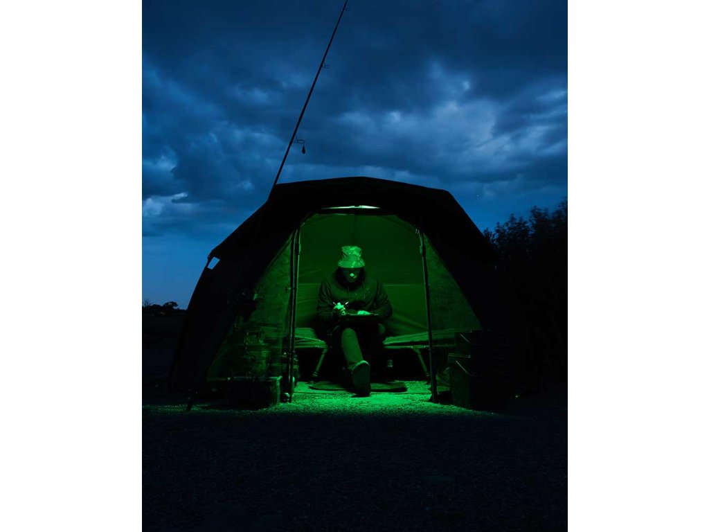 Dálkově ovládané LED světlo s magnetickým upevňovacím prvkem a kovovou destičkou pro zavěšení v bivaku.