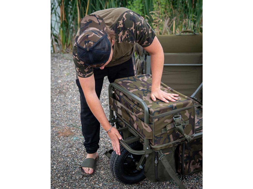 Navržený s ohledem na potřeby rybáře na jednodenní výpravě, velmi kompaktní vozík Explorer je možné nastavit pro použití na delších výpravách, kdy lehátko a další materiál je nezbytnou součástí výbavy. Celý koncept transportního vozíku Explorer umožňuje při krátké jednodenní výpravě ponechat většinu přepravovaného vybavení na vozíku, a doslovně rybařit z vozíku, balení a přemisťování mezi jednotlivými lovnými místy je snadné a velmi rychlé. Přesto díky jeho chytře řešenému designu s roztažitelnou přední zábrannou je možné ložnou plochu rozšířit a vytvořit více prostoru pro přepravu více vybavení a lehátka. Rozšíření rozkládá přepravovanou hmotnost dalšího vybavení tak, aby přepravní vozík byl stále vyvážený. Vozík Explorer je plný možností a součástí dodávky je středový vak Under Barrow Bag ve Fox Camo vzoru, dvě síťované kapsy po obou stranách kolečka ideální pro přepravu 5l kanystru s vodou a nástrah. Vozík Explorer byl navržený jako perfektní přepravní systém na krátké jednodenní vycházky. Středový vak i obě boční kapsy jsou vybavené bočním zipem umožňující rychlý a snadný přístup k přepravovanému obsahu bez potřeby skládat cokoliv z vozíku. Verze Mk2 byla vylepšena látkou s naším větším camo vozem a výškově nastavitelnými ručkami.